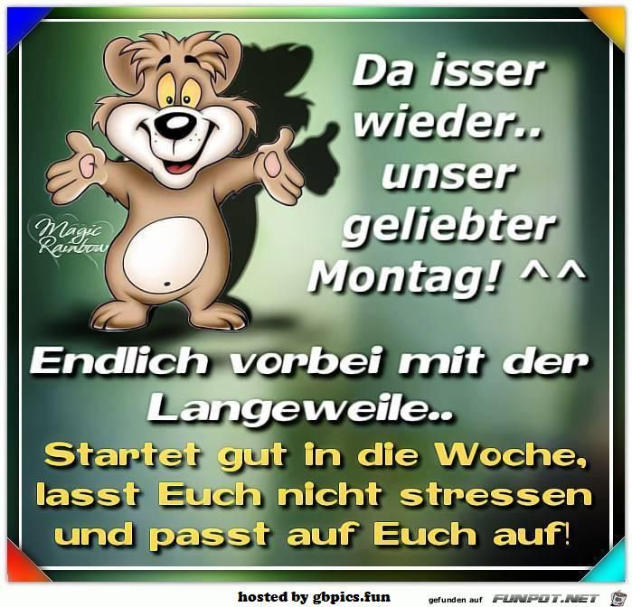 If you find this site serviceableness, please support us by sharing this posts to your preference social media accounts like Facebook, Instagram and so on or you can also Download this blog page with the title Wochenstart Lustig Guten Morgen Montag by using Ctrl + D for gadgets a laptop with a Windows operating system or Command + D for laptops with an Apple operating system. If you use a smartphone, you can also use the drawer menu of the browser you are using. Whether it's a Windows, Mac, iOS or Android operating system, you will still be able to bookmark this blog.